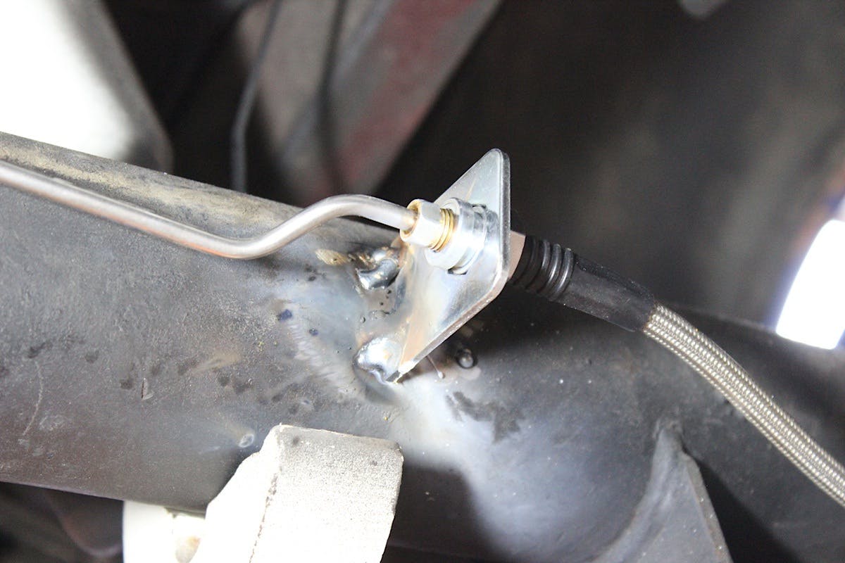 The rear brake lines were a little more difficult. Since the rears were now disc brakes with braided lines, the hard lines needed to be shorter. Luckily, The Right Stuff has pre-bent lines that are shorter, making the job easier. The hardest part was that we had to weld supplied tabs onto the axle tubes to hold the metal lines and braided lines in place. We slowly tacked them and didn’t weld them all at once to avoid any warping. Once they cooled off, we installed the new hard lines and rubber flex hose that mounts to the top of the housing.