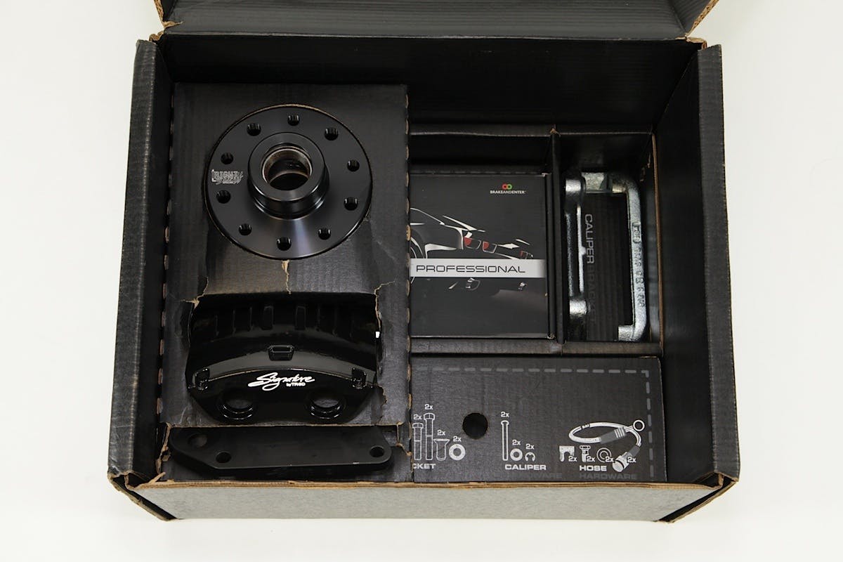 With all the bargain brakes off the car, the time came to start installing new brakes from Ground Up. We started by laying all the parts out to keep things organized. Everything was well marked in their respective boxes, making it easy to see that we had all the parts needed. We started by installing the front disc brake assemblies, then we moved to the rear, and finally the lines and master cylinder.