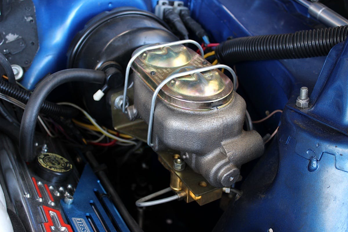 Since we had no plans of reusing 45-year-old brake lines, we cut and pulled the original lines out of place, but being careful to keep the retainers in good shape so we could reuse them. The last part to take off the car was the booster and master cylinder setup. Contorting ourselves under the dash, we removed the cotter pin and clevis pin attached to the brake pedal. All that was left was to remove the three nuts that held the booster and master combo to the firewall. For the sake of uninstallation and installation, we unbolted the fuse panel from the firewall which gave us more room to get the booster.