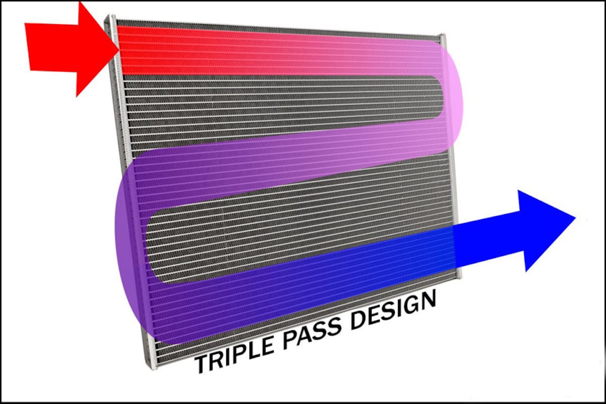 A single-pass radiator is one that flows one way — be it from top-to-bottom or side-to-side. A triple-pass radiator is actually divided internally. Hot coolant enters the radiator, flows from one side to the other, turns and goes back to the other side, and then makes one more turn and then exits the radiator. The benefit of having multiple passes is, the coolant spends a longer time exposed to the core, which adds extra time for it to cool your engine even better.