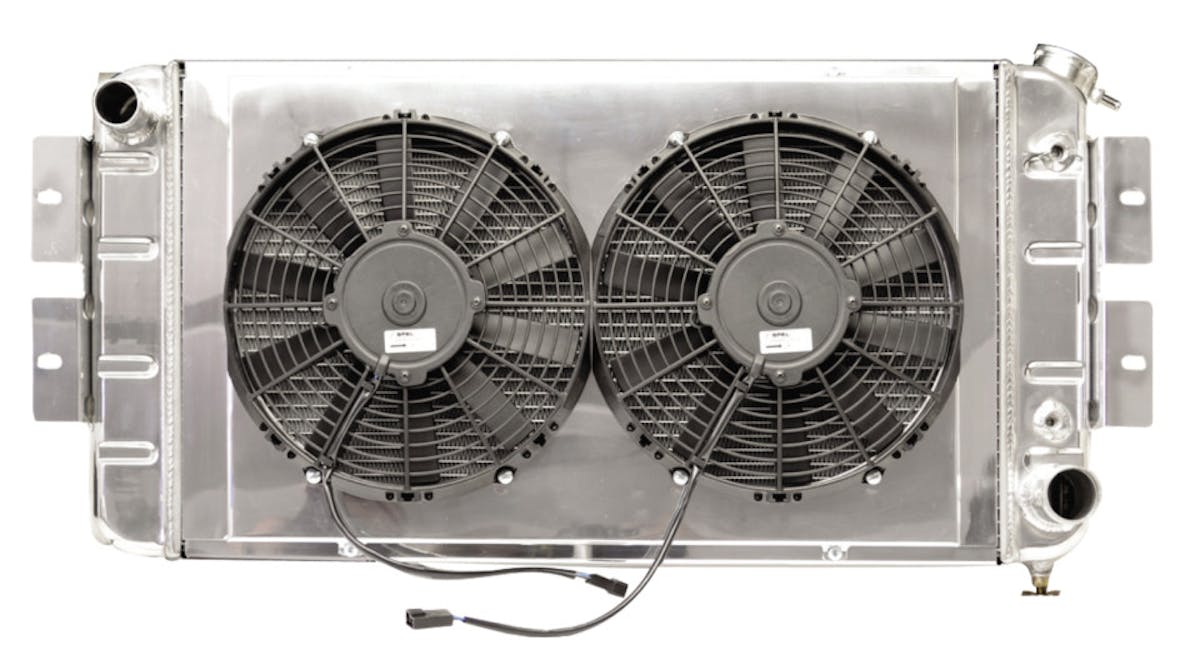 Switching from a factory-style downflow design to a crossflow can be an easy conversion according to the folks at Danchuk. They offer a several radiator designs to fit in front of the core support that deliver crossflow capability and improved cooling. The radiator we’re featuring here is an all-aluminum, fully polished crossflow system with shrouds and dual SPAL fans.