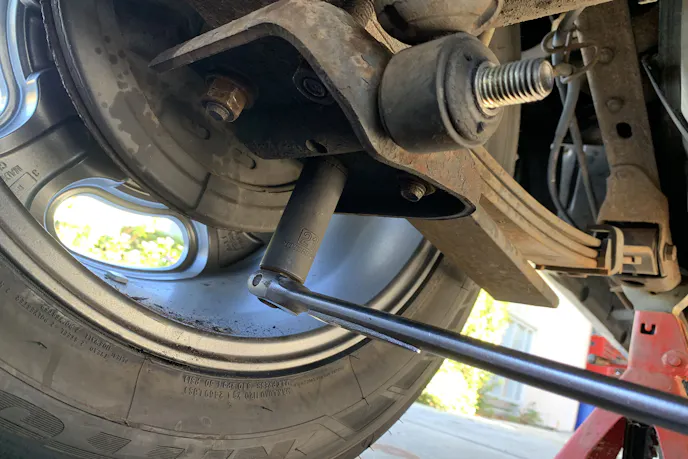 We began the first leaf spring extraction by removing its rear bolt from the shackle. If the shackles are in good shape, there’s no reason to mess with the upper bolt. This allowed the spring, as well as the rear tire, to rest on the ground while we removed the front bolt and spring completely. We slid the new spring, with its shim, into place and installed the front bolt. Leaf springs are bulky, so getting a bolt through the front mount helped keep it from flopping around.