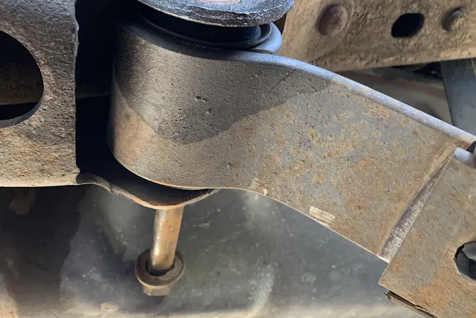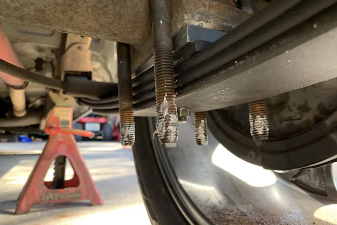 We began the first leaf spring extraction by removing its rear bolt from the shackle. If the shackles are in good shape, there’s no reason to mess with the upper bolt. This allowed the spring, as well as the rear tire, to rest on the ground while we removed the front bolt and spring completely. We slid the new spring, with its shim, into place and installed the front bolt. Leaf springs are bulky, so getting a bolt through the front mount helped keep it from flopping around.