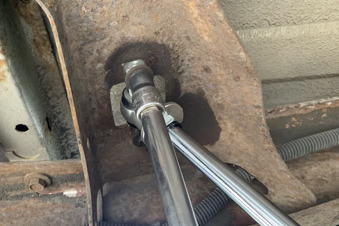 Removing the OEM spring fasteners is where things get a little tricky. The front leaf spring bolts are installed at the factory with the nuts facing out. That means the bolt needs to slide toward the middle of the truck to be removed. That’s fine until you realize there is now a fuel tank in the way on the driver’s side that obviously wasn’t there when that bolt was installed.