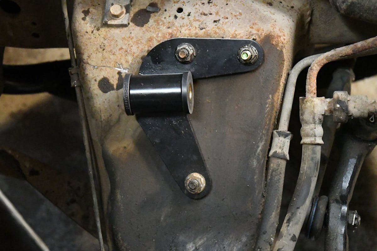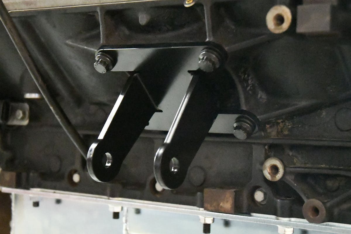With the transmission secured to the engine, the BRP Hot Rods adjustable transmission crossmember made short work of hanging the rear of the transmission. It’s a unique design as it has multiple holes that allow you to slide the cross member forward and back depending on the transmission used. We set it up for our TCI 4L80E and then bolted everything down.
