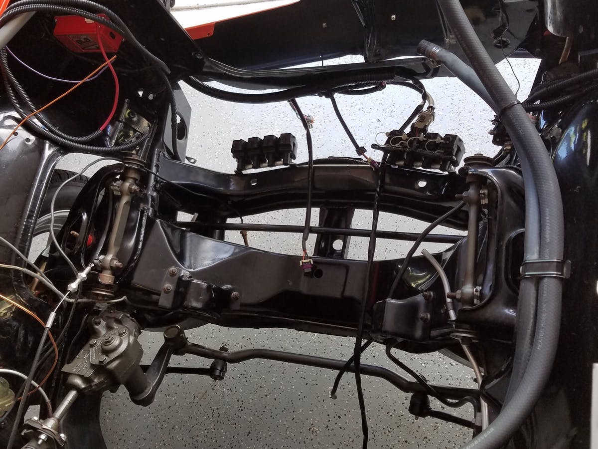 Michael already had the classic small-block removed from the car in preparation for the LS install. He also had the coils mounted to the engine crossmember with brackets he made himself.