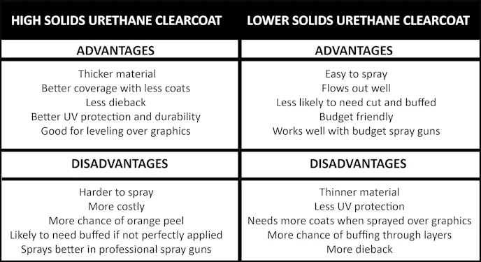 High-solids clearcoat has a higher concentration of resin and a smaller amount of solvent or VOC (volatile organic compounds.) Universal or lower solids urethane clear has less resin and more solvents. High-solids clearcoat has a smaller molecular structure than lower solids.