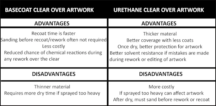 So, which is better for leveling out graphic and artwork edges; urethane or basecoat clear? There are pros and cons to each method. Some painters swear by basecoat clear; others, like me, will only use urethane. The best thing to do is to weigh the advantages of each system and find out what works best for you.