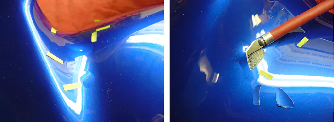 If I’m working over a basecoat-cleared surface and the airbrush trigger sticks open, unwanted paint material can blast onto the surface. The solvents in that unwanted material can penetrate the basecoat clear, and even the color coats, beneath it. Because basecoat clear has a thinner-mil thickness than urethane, I could sand through it and into the color before the mistake is removed.