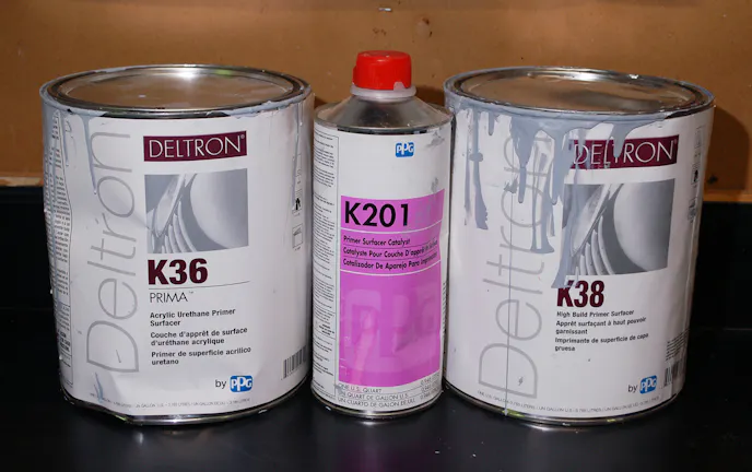 Polyester primer is a very thick two-part product and is used when there’s a good deal of bodywork. Poly primer is great for using over bare fiberglass and epoxy. It’s a high-solids product and has minimal shrinkage. It sands easily and is perfect for getting those wavy panels straight. Think of it as a sprayable body filler. Using this product can save hours of time. Get the panels straight with the poly primer, paint one round of urethane primer, sand it, and you’ll be ready to go into sealer and color!