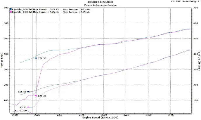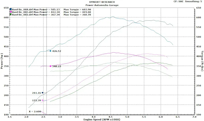 With Cunningham’s custom tune in place, the car knocked down a stellar 585.1 horsepower number to go with 603.9 pound-feet of torque. That’s a huge improvement of 172.7 horsepower and 184.8 pound-feet of torque at only 7.5 pounds of boost, still with our mixture of junk fuel and good fuel and a lack of tuning time to maximize the system’s performance on that day.