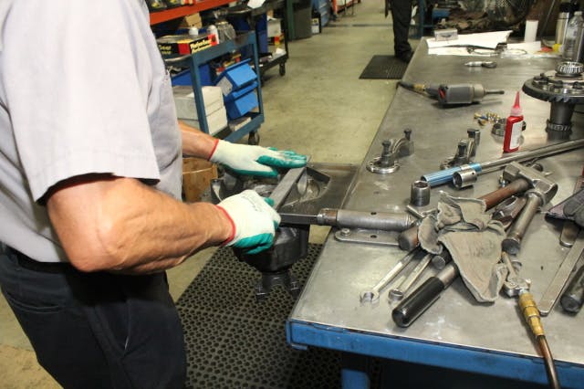 Starting at the hydraulic press, the bearings were pressed on to Eaton’s Detroit Truetrac carrier. Using precision, hand-made press sleeves, seating the heavy duty carrier bearings on each side of the carrier is performed precisely and quickly.