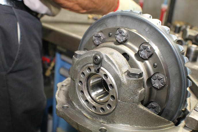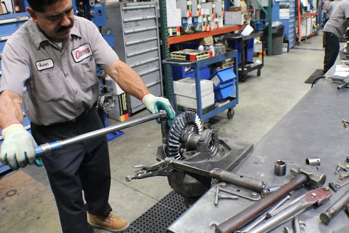 As with every station that the rearend housing moved to, a good cleaning and measuring was top of the list at the final assembly station. The axles were test fit after an alignment jig was placed in the center section. Satisfied with the test fitment, our technician applied a bead of RTV around the center section flange, along with a gasket topped with another long bead of RTV sealant. The third member was dropped in and torqued while the axles were at another station having the wheel studs and bearings pressed on.