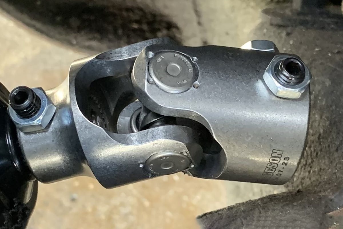 The previous owner said he replaced the inner and outer tie rods, but we were about to learn how many other joints were in the steering system contributing to slack-stack-up. One of the biggest offenders was the oil-soaked rag joint on the intermediate shaft that goes between the steering box and the steering column. Replacing the rag joint (and the intermediate shaft) isn’t complicated, and is a great way to upgrade the communication between the steering box and steering wheel. We turned to the folks at Borgeson Universal to completely remove any play in our intermediate shaft and prevent the decay of the rag joint material from ever happening again.