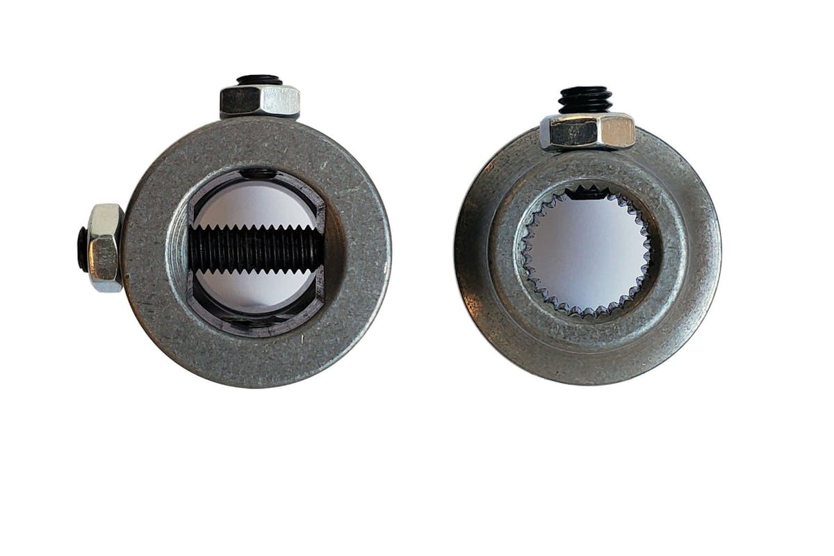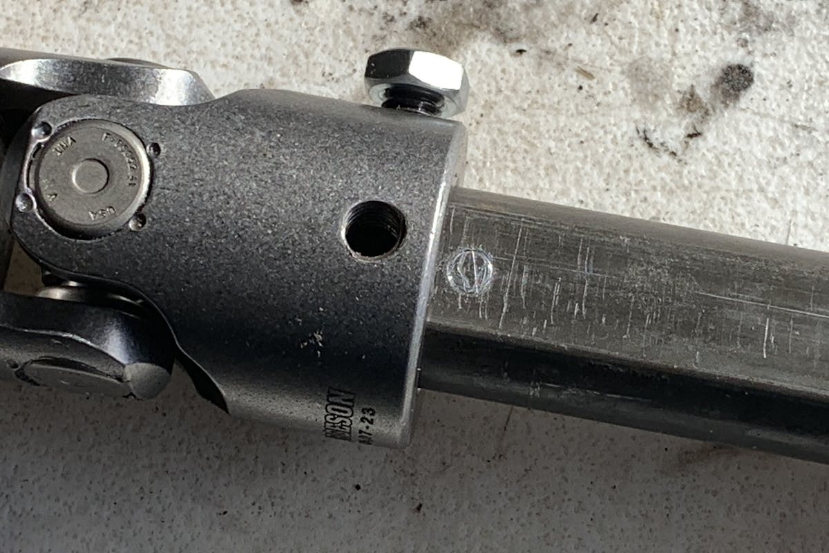 The steering box shaft is a 3/4-inch shaft with a 30-spline fitting. We ordered a steel Borgeson 1-inch DD x 3/4-30-spline universal for the steering box shaft. There are a few things to note when removing the intermediate shaft. The original rag joint used a cross-bolt to hold the rag joint to the shaft. The Borgeson universal uses two Allen bolts to fasten the universal. The bolt on the side for the flat surface of the new shaft is long enough so you can drill a hole into one flat side of the shaft. The bolt will go through the shaft and tighten against the inside of the other flat side. You only need to drill through one flat side of the shaft!