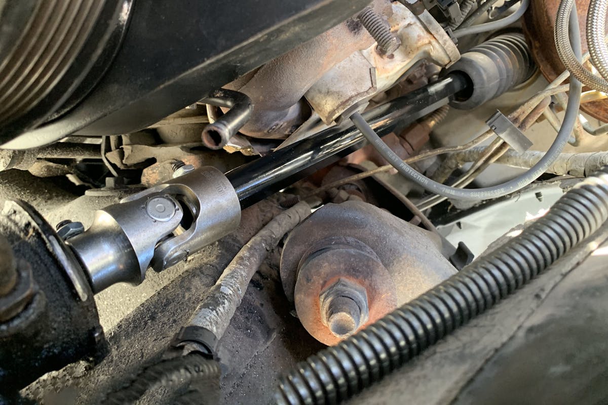 Instead of relying on a rag joint to relay the rotation of the steering shaft, we opted to upgrade to a Borgeson universal joint for absolutely precise communication between our steering wheel and the box. The best part about this upgrade is that it is relatively simple, but the improvement in the steering from a worn-out rag joint upgrade can be massive.