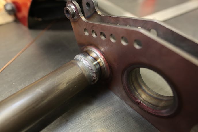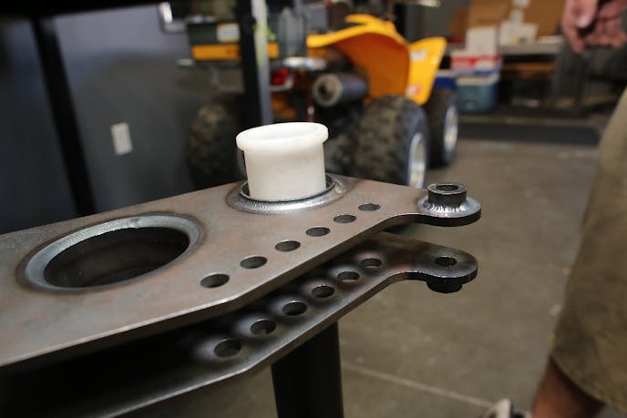 The remaining housing mount can now be installed over the cross tube to verify the fitment prior to final welding. The second billet arm can be installed on the splined torsion bar. If the fitment appears to be correct, the second housing mount can be tack-welded to the cross tube. It’s important to remove the spline torsion bar and nylon flange bearings before final welding, as the heat from the welding process can deform the bearings.