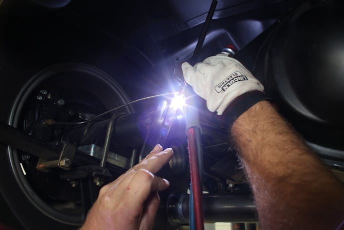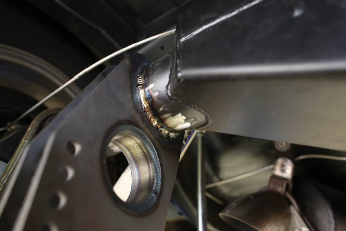 Now that the anti-roll bar mount is welded to the differential housing, the arms can be connected to the chassis of the car with the provided links. For our application, a round tube was welded between the framerails of the car so the brackets for the link arms could be installed. The mounting tabs for the link arms were TIG-welded to the cross bar to create a solid connection to the frame of the car.