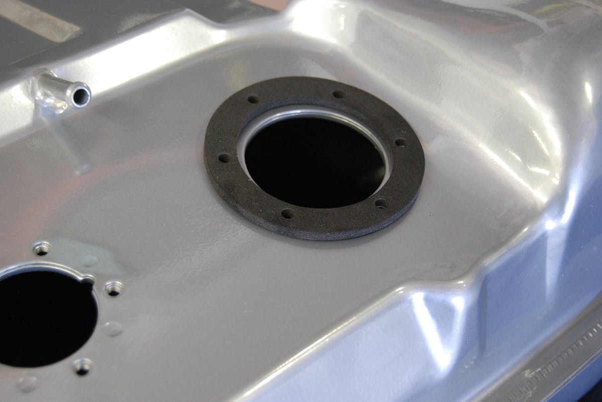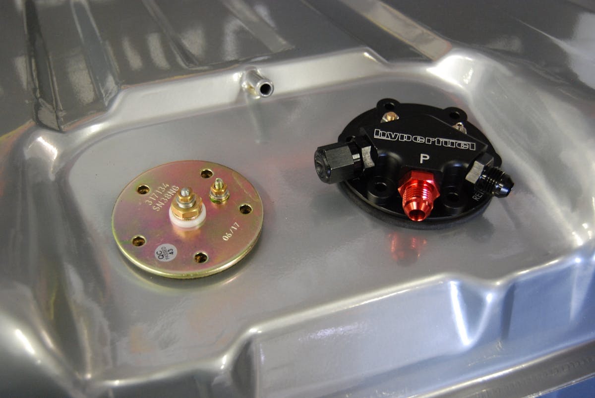 The line of Hyperfuel fuel-injection-ready, direct-replacement tanks feature internal baffling with an extra-large 4.8-liter dual-tube-baffled fuel tray to prevent fuel-pump starvation. These stamped-steel reproductions of original fuel tanks require no modifications to mount in the car. The tanks include a five-hole 0- to 90-ohm sending unit for your fuel gauge, a high-quality fuel pump, mounting straps, and filler neck. The fuel sender and pump are recessed in the tank to not interfere with the car body during tank installation, and the in-tank, 440 lph EFI fuel pump (Part No. 40017) supports up to 1,500 horsepower on pump gas and 1,100 horsepower if running E85.
