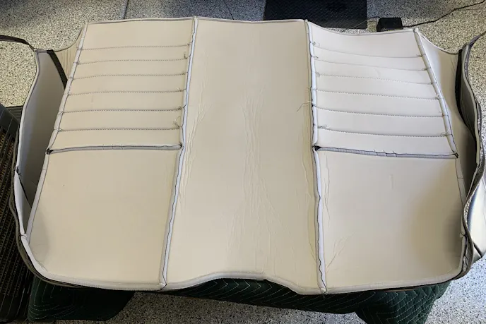We started with the rear seat frame. Our new, custom rear seat covers spent some time out in the sun to help soften the material so it would be more pliable when stretching it over the seat frames. As you can see from the “before” photo, our interior wasn’t in bad shape, since the rear seat was hardly used since the car was redone decades ago. The foam and burlap covering the seat frames were in satisfactory condition. If your seats are shot or if you don’t have these necessary materials, speak with a TMI representative to complete your installation.