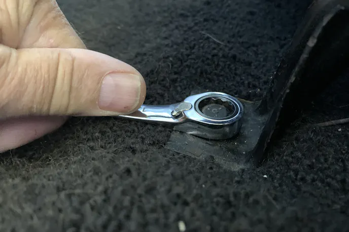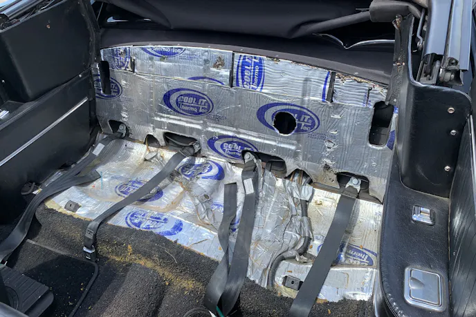 We carefully removed the front and rear seats from the vehicle. Each front seat is held in place with four fasteners; remove them by sliding the seat forward or back to gain the best access. The bottom of the rear seat simply snaps into place and can be removed by lifting the front of the seat up and then forward. The back of the rear seat is bolted to the divider between the interior and the trunk. Remove two bolts and lift up to extricate the seat back from the vehicle.