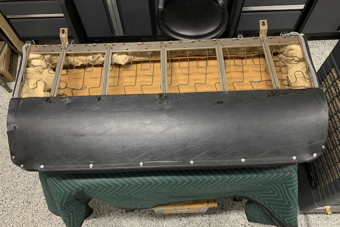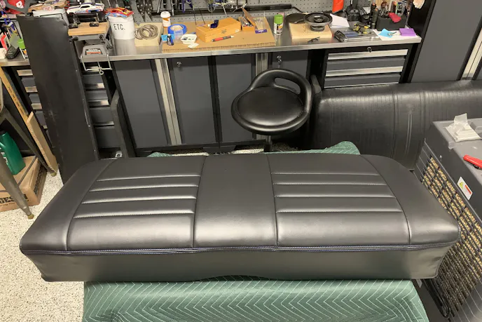 We started with the rear seat frame. Our new, custom rear seat covers spent some time out in the sun to help soften the material so it would be more pliable when stretching it over the seat frames. As you can see from the “before” photo, our interior wasn’t in bad shape, since the rear seat was hardly used since the car was redone decades ago. The foam and burlap covering the seat frames were in satisfactory condition. If your seats are shot or if you don’t have these necessary materials, speak with a TMI representative to complete your installation.