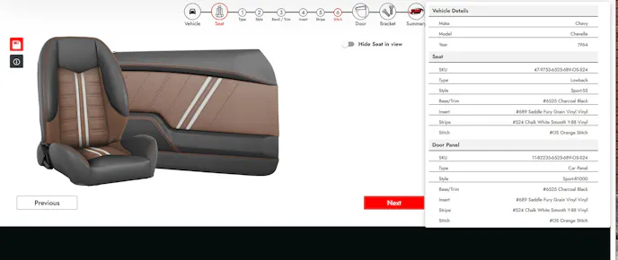Designing a custom interior for our pride and joy isn’t a place for a “try it and see” attitude. Even when working with talented craftsmen, one is often left with trusting someone’s better judgment when choosing colors and the overall design. The beauty of TMI’s Custom Interior Configurator is that it allows you to see what a custom interior design will look like before plunking down your hard-earned cash. TMI’s configurator does not illustrate every style of seat the company offers, but viewers can choose between several TMI offerings to get a very good idea of what their interior will look like when it arrives at their door. Simply start by filling in some information about your vehicle, and the configurator opens up the world of custom interior options.