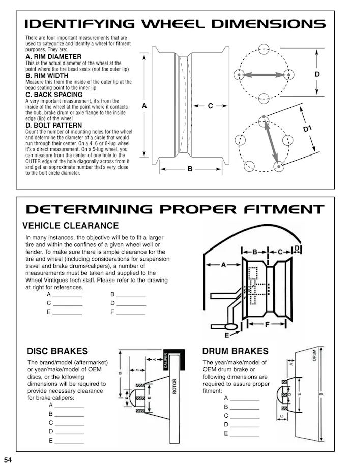 The inside diameter of the wheel is also important if your car happens to have a big brake upgrade. Some brake companies are vague about minimum wheel diameter clearance, because each wheel company’s dimension for a given diameter varies with the style of the wheel. What this means is that you can’t assume that all 15-inch wheels will clear a set of Wilwood brakes with 12.19-inch rotors.