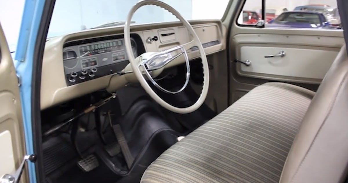 This flatside version appears to be all original, from the badging to the interior. The black and tan color interior seems to be the most common in the first gen later years. The three on the tree shifter tells us that the three speed transmission option is installed. Exterior factory colors included sky blue, cream and white, so this paint job is period correct as far as we can tell.