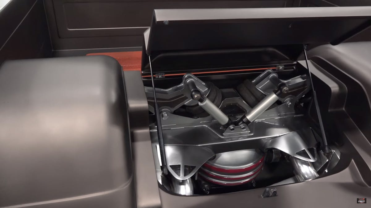 The top pictures show how the hood opens as one flat piece, like a modern car or truck. The bottom two show the stunning rearend and rear suspension system through the access hatch in the bed.