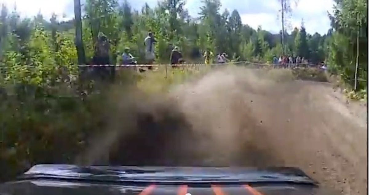 The driver is calm and cool, piloting the Camaro with ease. Even on the slick dirt road, he slides the back end around with ease. This reminds us of any episode of Dukes Of Hazzard with the Duke boys sliding the General Lee around the back woods. At one point, he roosts the spectators on the side of the road, now that’s up close to the action!